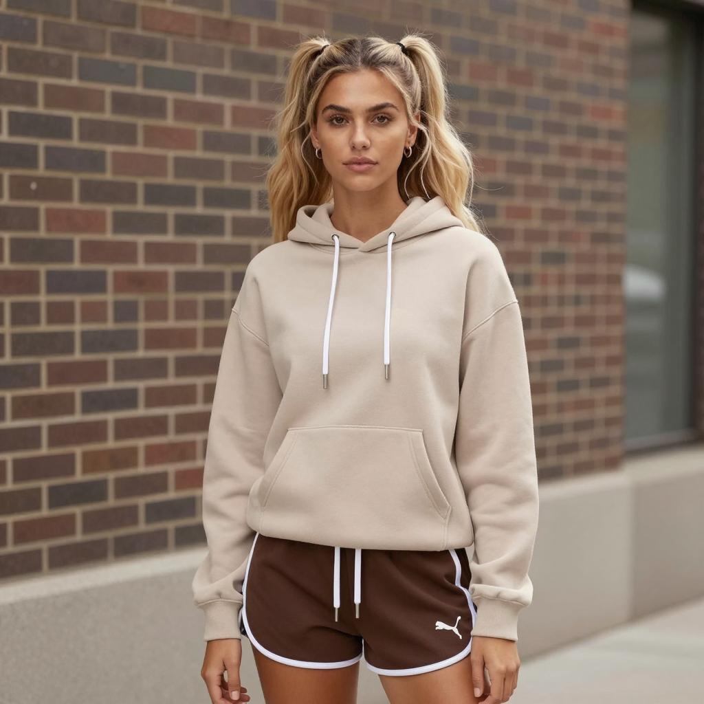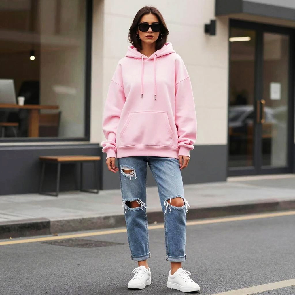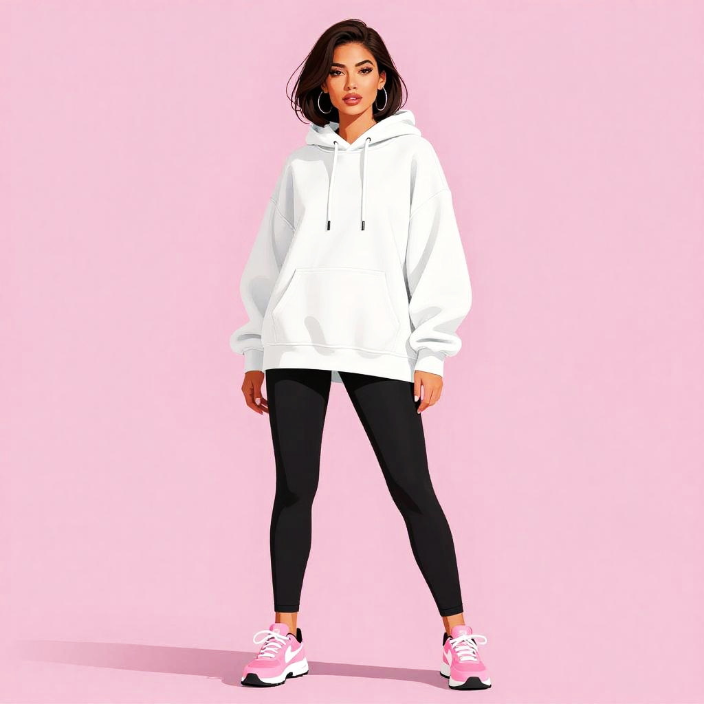 A confident woman stands against a solid pink background wearing a white oversized hoodie, black leggings, and pink sneakers. The illustration showcases a modern, digital art style with smooth lines and vibrant colors that highlight casual streetwear fashion.