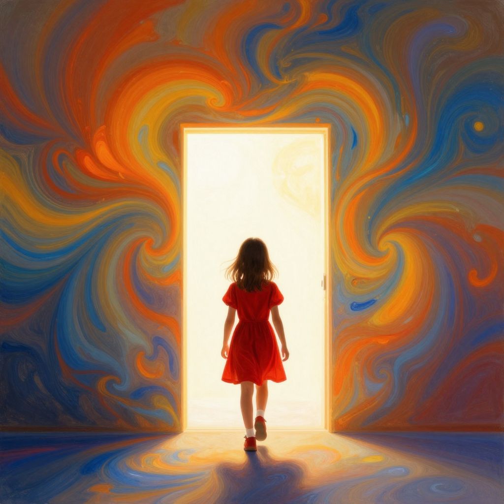 A child in a vibrant red dress strides toward a luminous doorway framed by a wall alive with swirling hues of orange, yellow, and blue, as if the act of stepping forward ignites a dynamic, ever-shifting canvas of color and light.