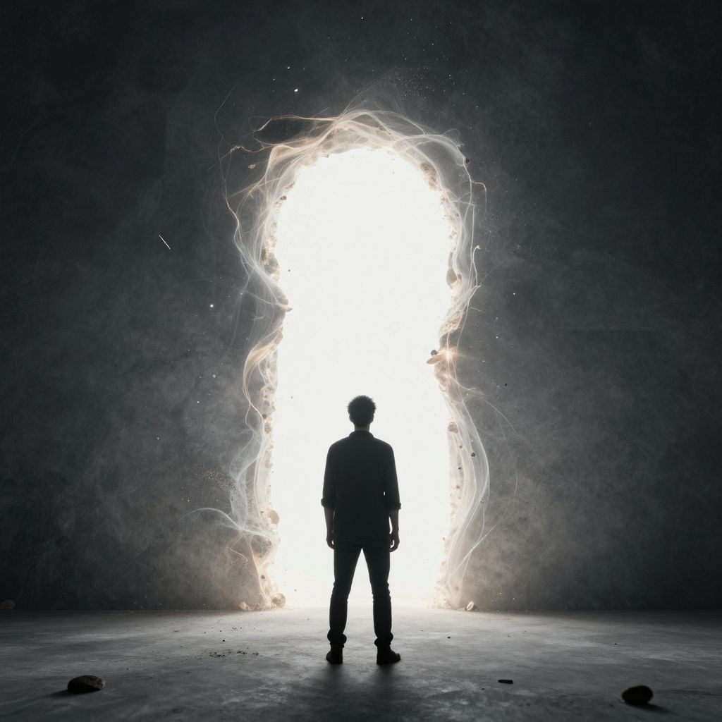 This digital painting depicts a silhouette of a young girl with wavy brown hair, wearing a red dress and black shoes, standing in a brightly illuminated doorway. The background features swirling, abstract patterns in vibrant orange, blue, and yellow hues, creating a hypnotic, psychedelic effect. The glowing doorway contrasts sharply with the colorful, textured wall, emphasizing the girl's figure. The floor reflects the colorful swirls, adding depth to the image. The overall style is surreal and expressive, with a strong use of light and color to convey a sense of mystery and wonder.