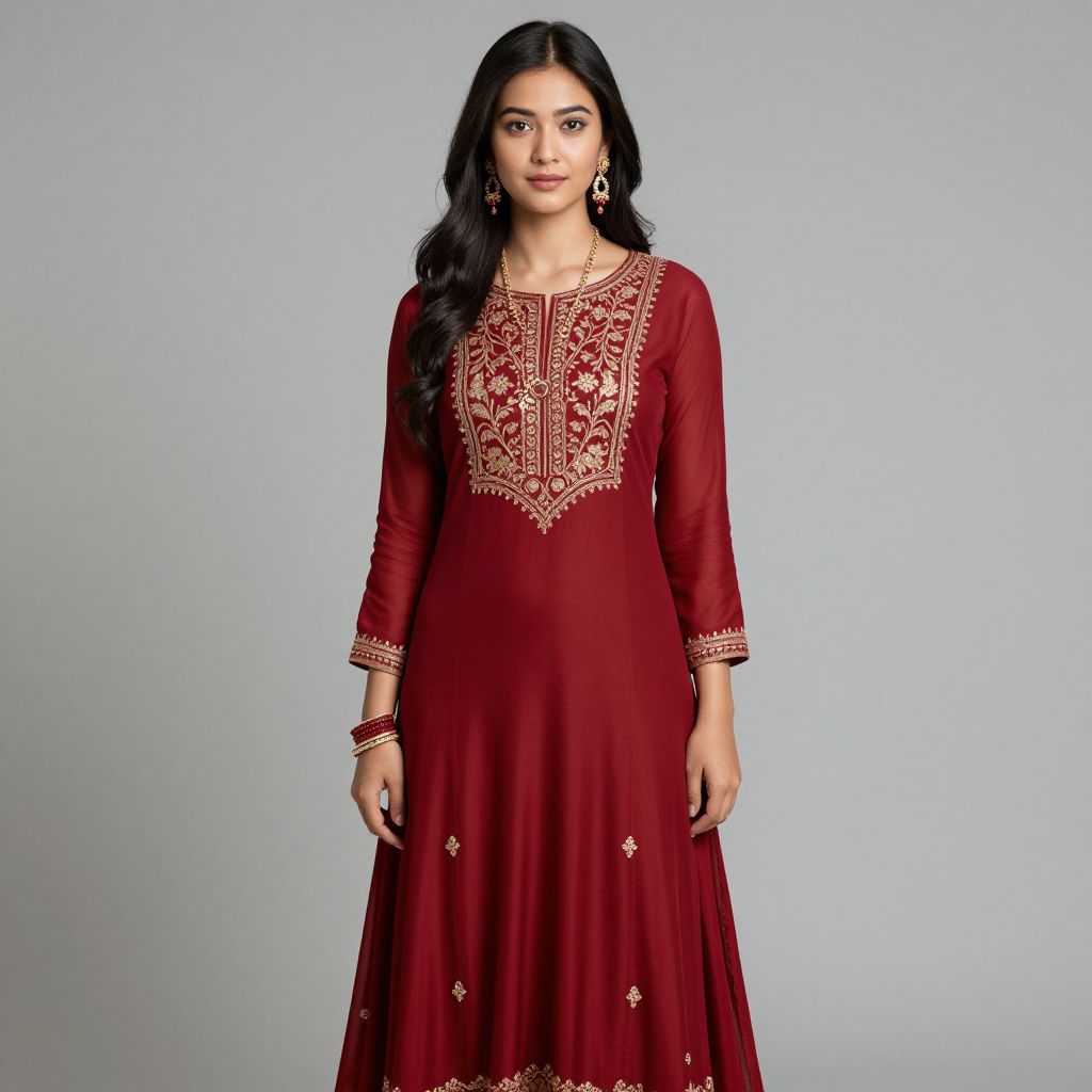 Banarasi salwar suit design, 1girl, jewelry, solo, necklace, dress, earrings, black hair, realistic, bracelet, long hair, red dress, looking at viewer, asian, standing