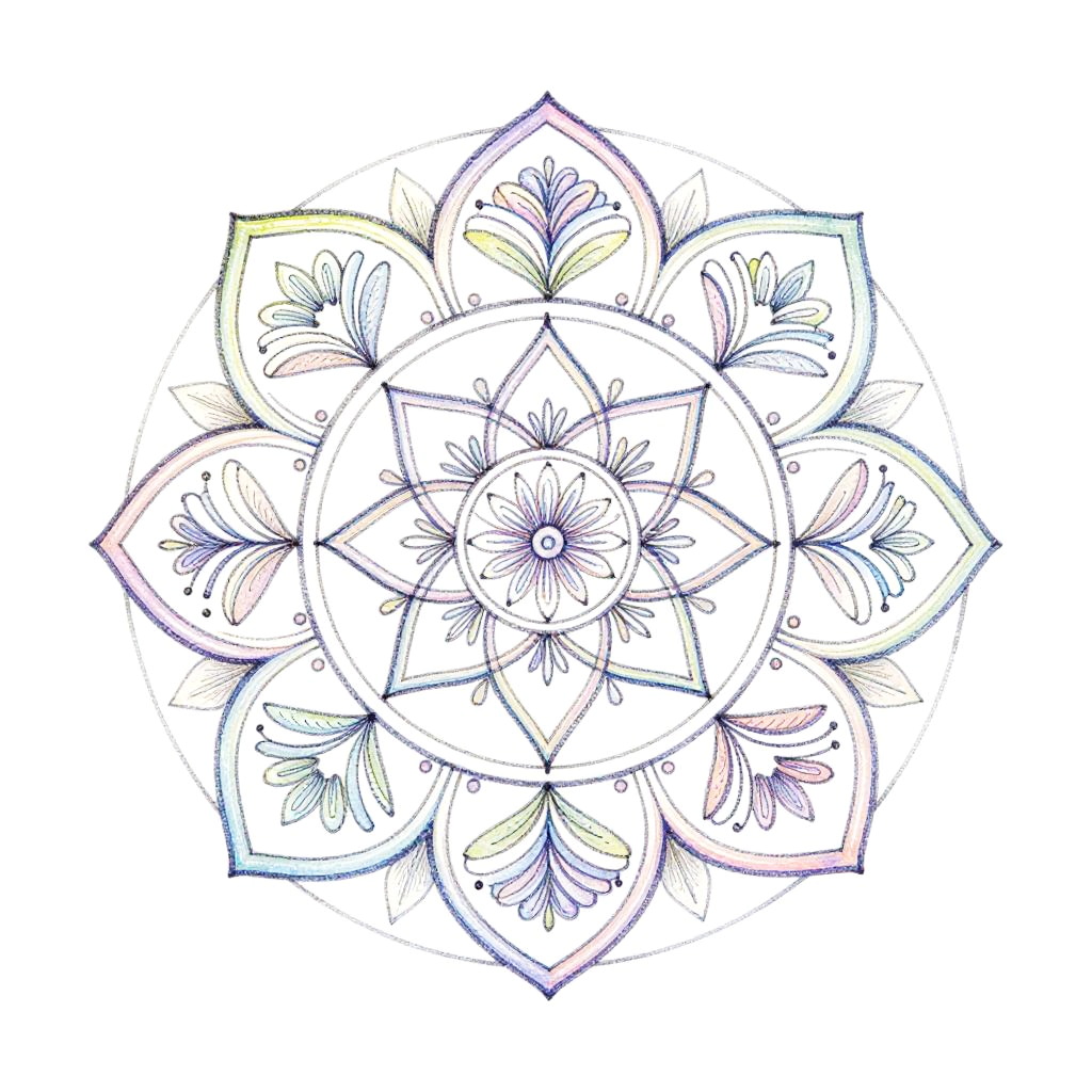 Mandala drawing online, highly detailed geometric shapes and floral elements interwoven in a perfect circle, delicate hand-drawn style rendered digitally, pastel color palette with subtle shadows, suitable for meditation and relaxation theme, clean white background