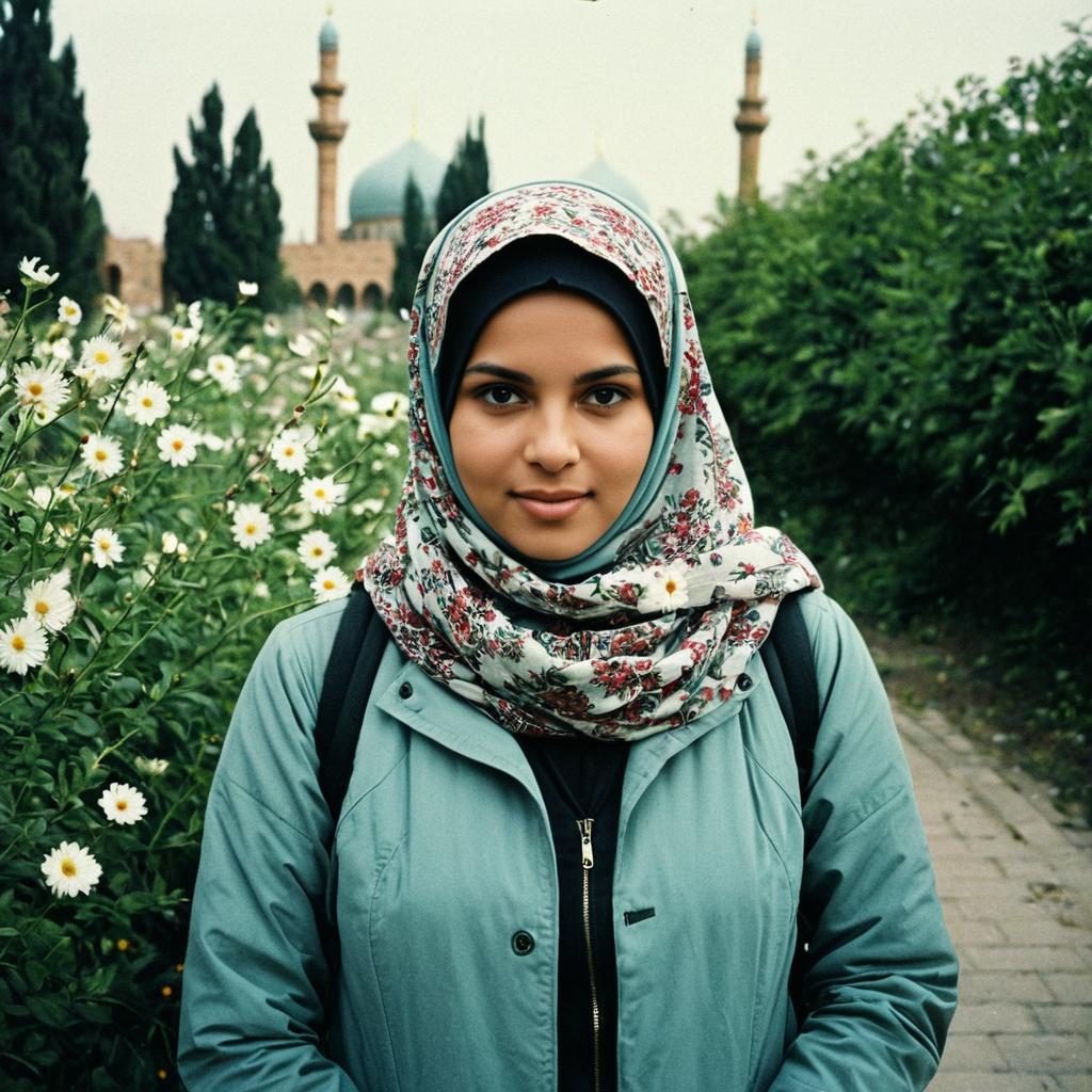 Islamic outfit woman,1girl,solo,flower,outdoors,hood,looking at viewer,scarf,realistic,standing