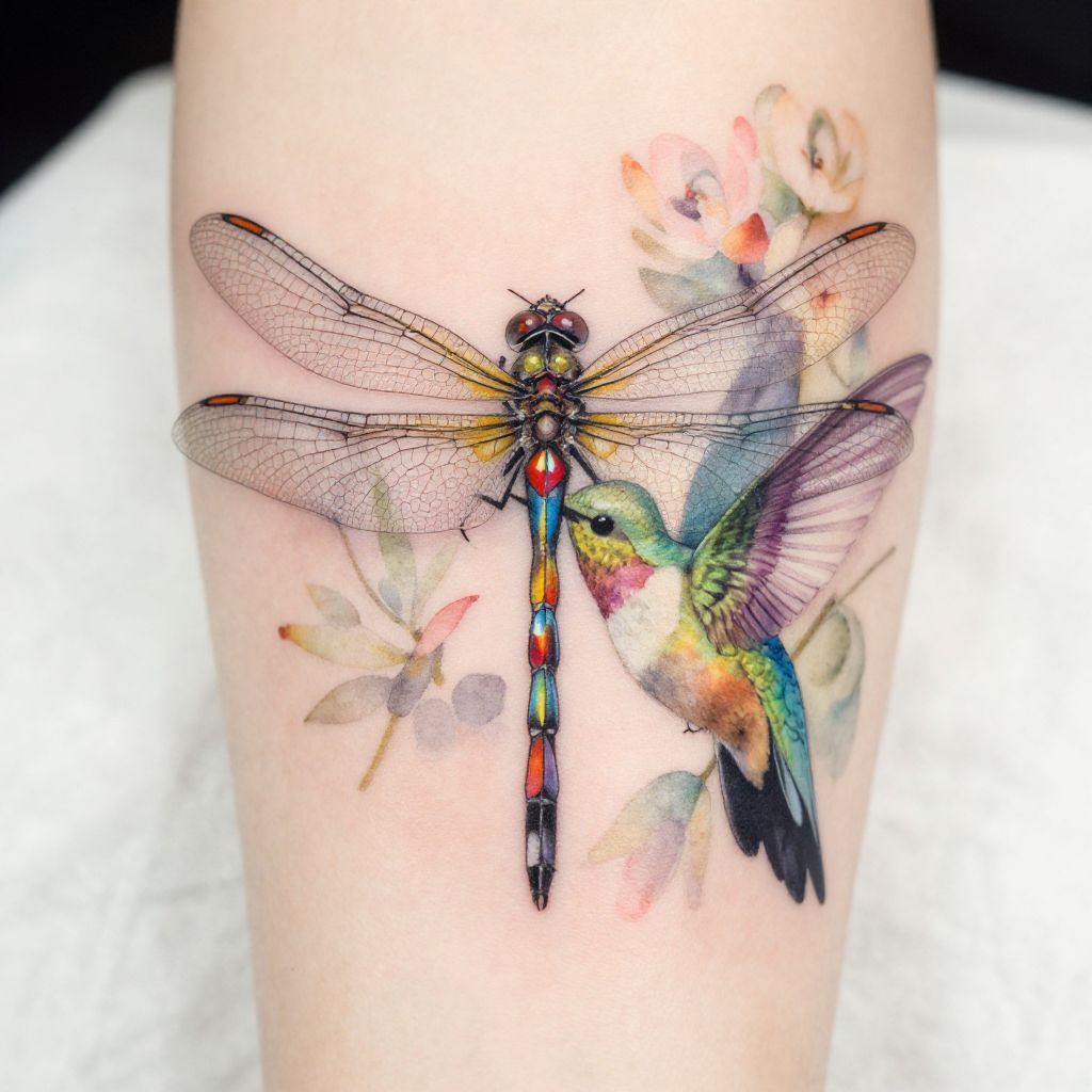 Dragonfly and hummingbird tattoo in vibrant watercolor style, delicate wings with intricate details, set against a soft floral background, blending nature’s elegance and grace with artistic tattoo flair, subtle pastels and rich jewel tones.