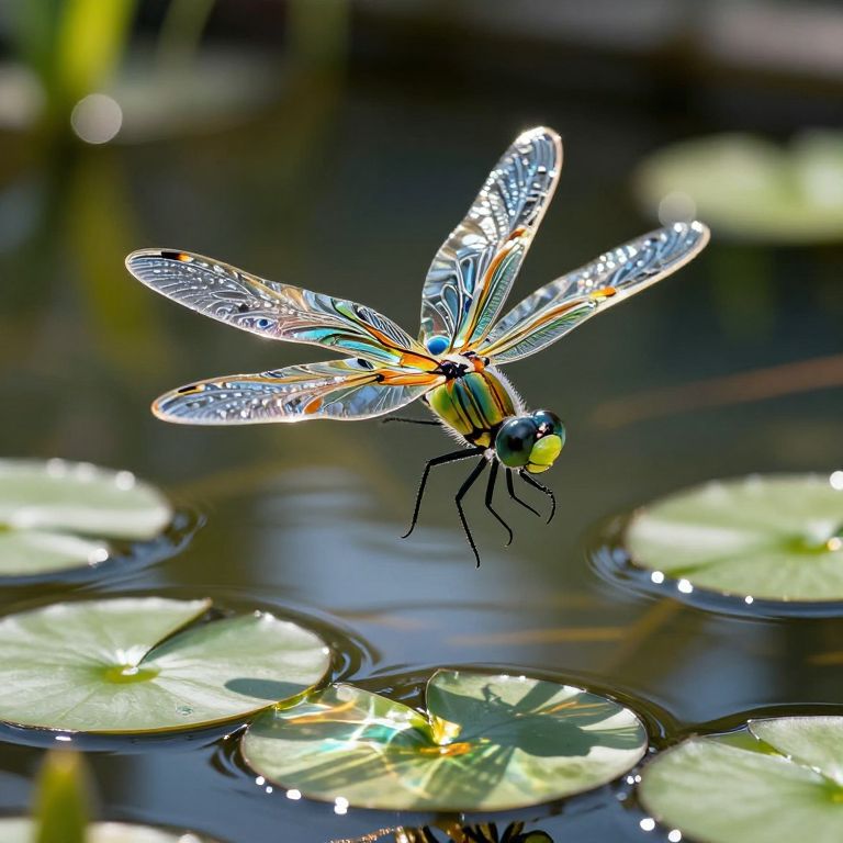 A majestic dragonfly crafted from shimmering glass wings, adorned with mesmerizing patterns and vibrant hues, gracefully dances above a tranquil pond. The delicate creature illuminates the surrounding water with an enchanting display of refracted light, casting captivating shadows onto the lily pads below. This evocative scene, observed from a unique vantage point beneath the dragonfly, masterfully captures a harmonious fusion of natural beauty and whimsical artistry, invoking feelings of wonder, serenity, and the magical essence of nature's hidden realms, reminiscent of the vibrant glass sculptures by a renowned artist known for their innovative approach to blown glass.