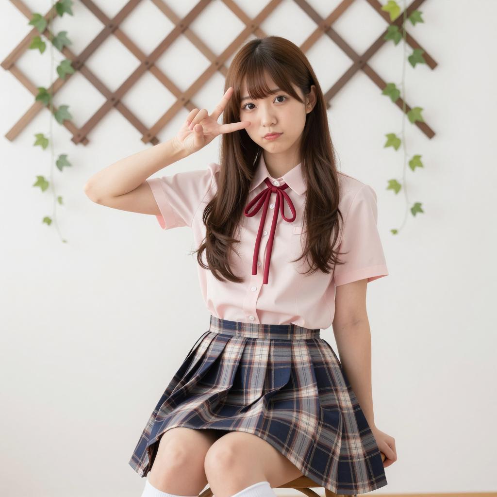 Portrait of an Asian young woman with light skin and brown shoulder-length hair, wearing a white shirt, beige vest with red and gold emblem, blue skirt, white knee socks, and black shoes. She is sitting on a red-patterned bench with her right arm raised and left arm holding her knee, legs crossed. The background features a glass wall with a reflection of the bench. Realistic photograph.