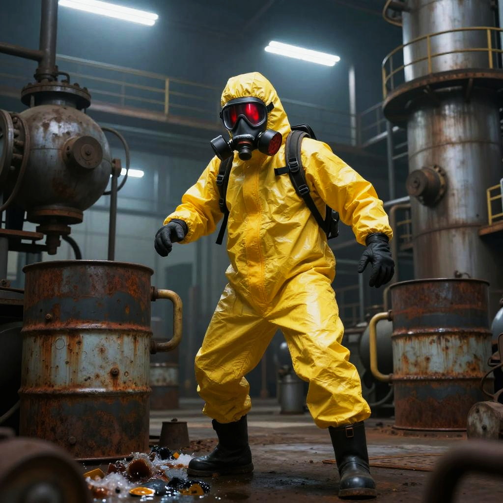 Hazmat suit soldier moving stealthily through an industrial chemical factory, bright yellow protective suit contrasted with rusted machinery and leaking barrels, dynamic pose with gas mask glowing red, eerie fluorescent lighting, post-industrial sci-fi concept art.