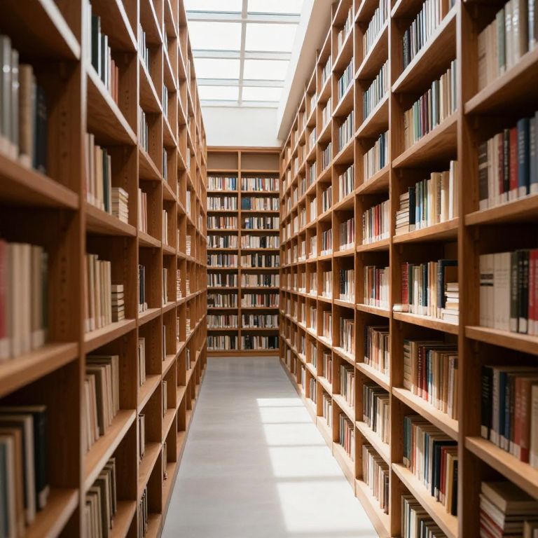 Library shelves stretch endlessly, their wooden frames filled sparsely with stacks of books, creating a serene corridor illuminated by natural light streaming through a skylight above.