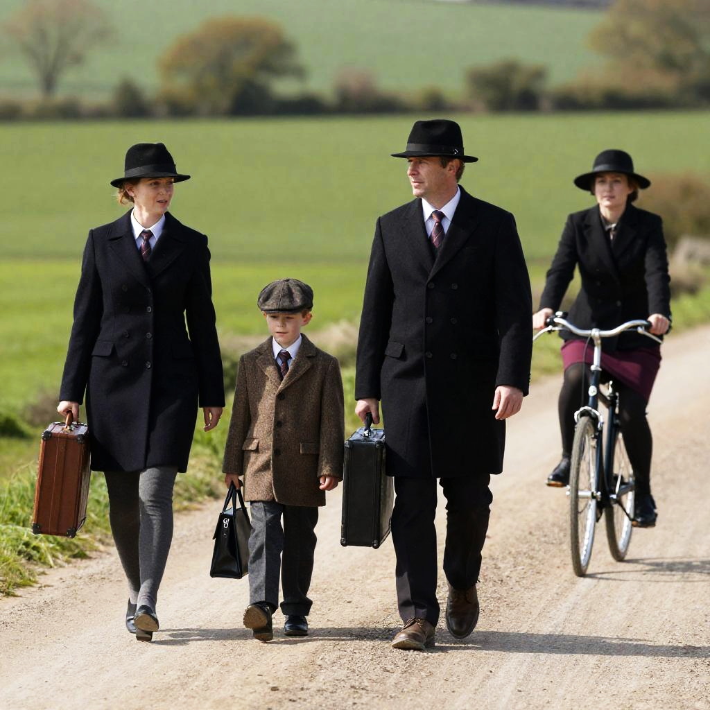 Photograph of four people walking on a dirt road. Two adults in black coats and hats, one carrying a suitcase. One young boy in brown tweed coat and flat cap, holding a black bag. One woman in maroon skirt and black hat, riding a bicycle. Green field and trees in background. Bright sunlight.