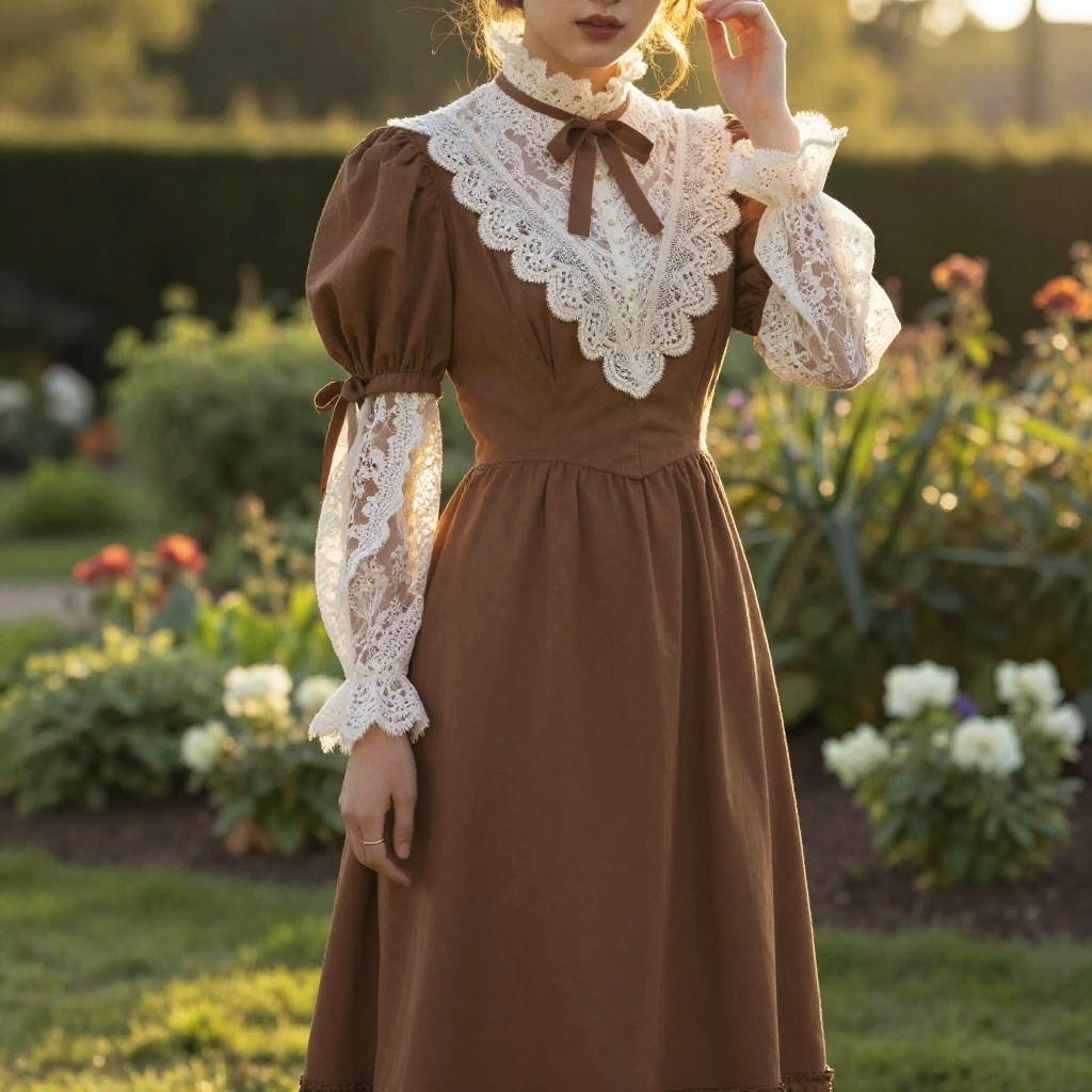 Brown Victorian dress with intricate lace details, high collar, puffed sleeves, standing in a lush garden at golden hour, soft natural lighting, vintage photography style