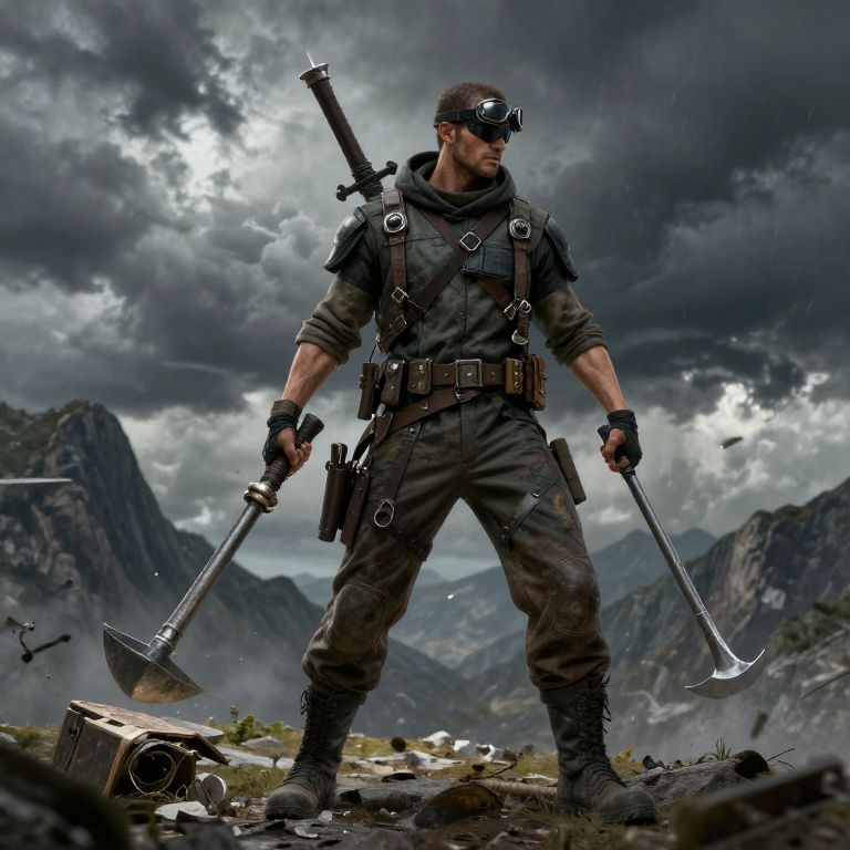 A digital art image of a muscular, dark-haired man in a black tactical outfit, wearing goggles, a utility belt, and fingerless gloves. He holds a pickaxe in his right hand and a shovel in his left. A rifle is strapped to his back. He stands amidst a rugged, mountainous landscape under a stormy sky with dark, ominous clouds. Debris, including a metal pipe, lies at his feet. The man's stern expression and powerful stance convey readiness and determination. The overall tone is gritty and intense.