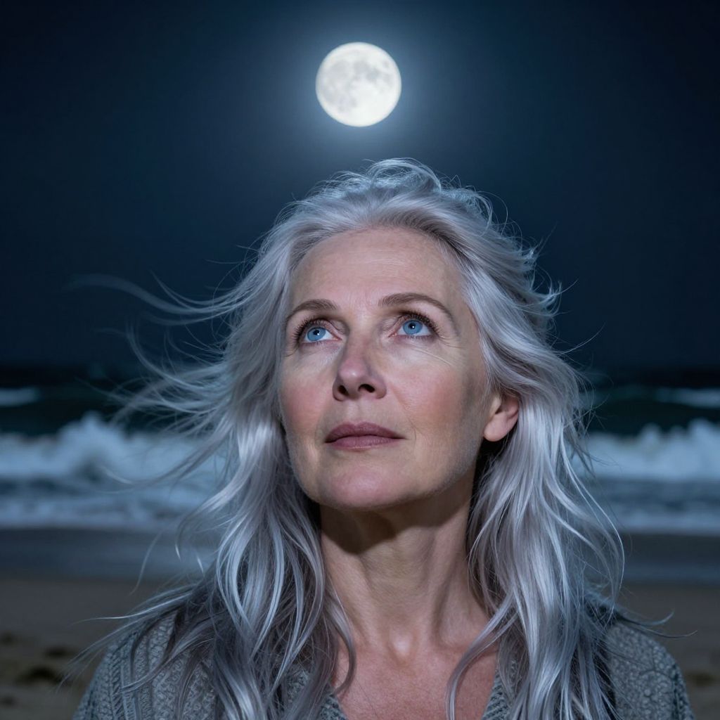 Photograph of a middle-aged woman with long, windswept silver hair and fair skin, gazing up at a bright full moon in a dark, night sky. She has blue eyes and a slightly pensive expression. Her gray jacket is slightly open, revealing a bit of her neck. The background shows a dark, sandy beach with waves gently crashing. The moon's light illuminates her face, casting a soft glow. The image has a dramatic, ethereal quality, emphasizing the contrast between her illuminated face and the dark surroundings.
