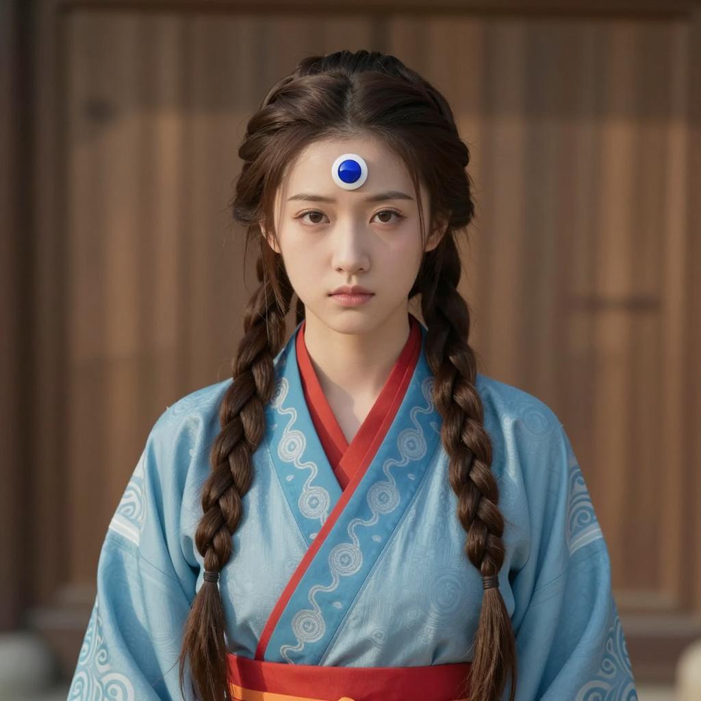 Costume makeup, digital painting of a woman, fantasy style, detailed makeup with blue and white facial patterns, red lips, dark braided hair, gold headpiece, ornate gold and turquoise earrings, white scarf, yellow and green kimono, gold and turquoise necklace with tassel, serious expression, neutral gray background, realistic ures, intricate details, portrait, front view, high contrast colors, traditional and fantasy elements.