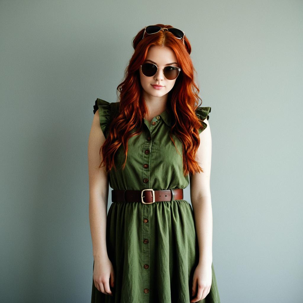 Portrait of a young woman with long red hair wearing a sleeveless olive green dress featuring ruffled shoulders, brown buttons, and a brown belt. She has dark sunglasses on her eyes and another pair resting on her head. The background is a plain light gray wall, with natural daylight illuminating the scene. The woman poses casually, showcasing a stylish yet relaxed look.
