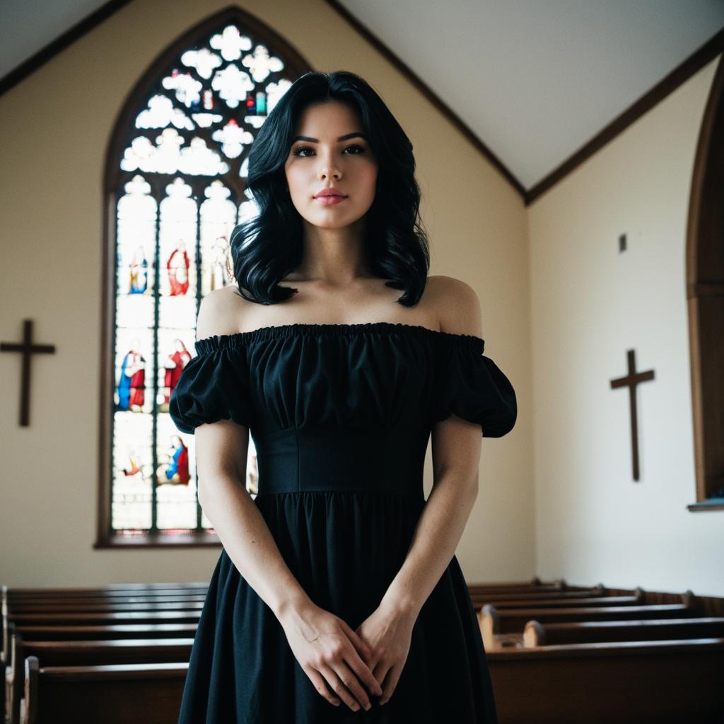 A man with black hair dressed in a black off-shoulder dress standing inside a church. The background features wooden pews, stained glass windows, and crosses on the walls. The subject has bare shoulders and a neutral expression.