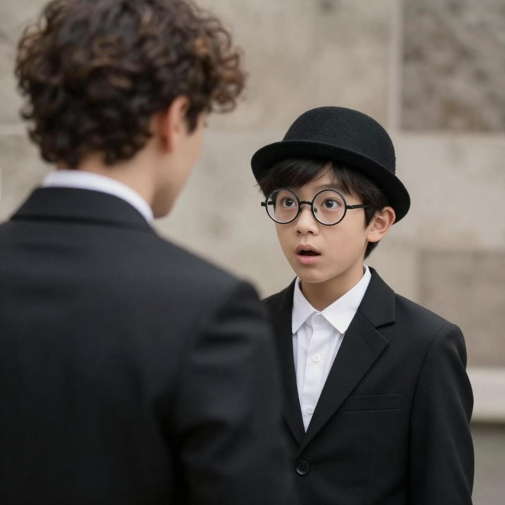 Young boy with round glasses, black cap, white collar, black suit, looking surprised. Man with curly hair, black suit, facing him. Stone wall background. Man's back to camera, boy's face visible. Intense eye contact. Photographic image.