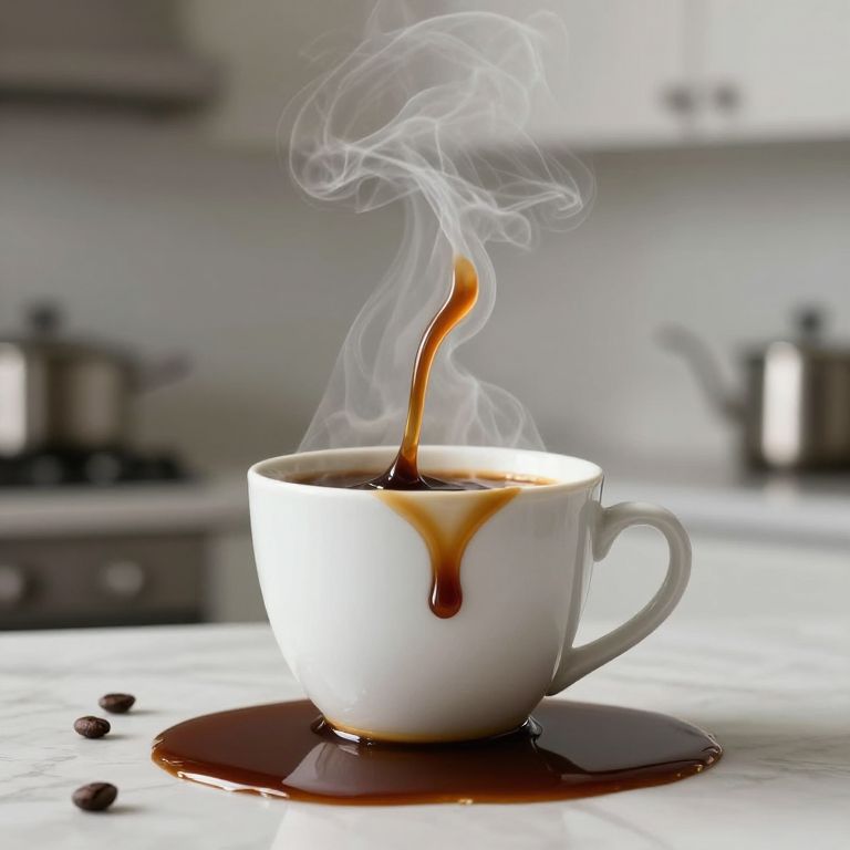 Photograph of a white ceramic cup on a white countertop, steaming with coffee pouring in, creating a brown puddle below.