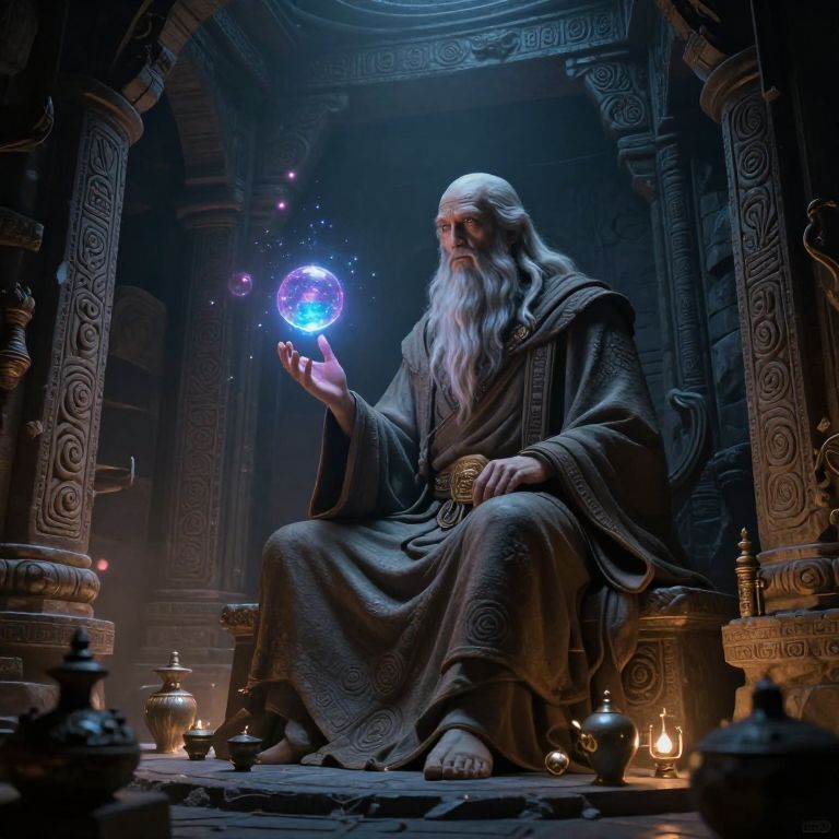 A digital illustration depicts an ancient, long-bearded wizard with a flowing white beard and hair, seated on an ornate, dark stone throne in a dimly lit, mystical temple. He wears a heavy, gray, patterned robe and holds a glowing, blue, ethereal orb in his right hand. The temple's walls are adorned with intricate carvings, and several small, lit candles and metallic vessels are scattered on the stone floor around him. The ambient light casts a soft glow on his solemn, wise face, and the background is shrouded in shadow, enhancing the mystical atmosphere.