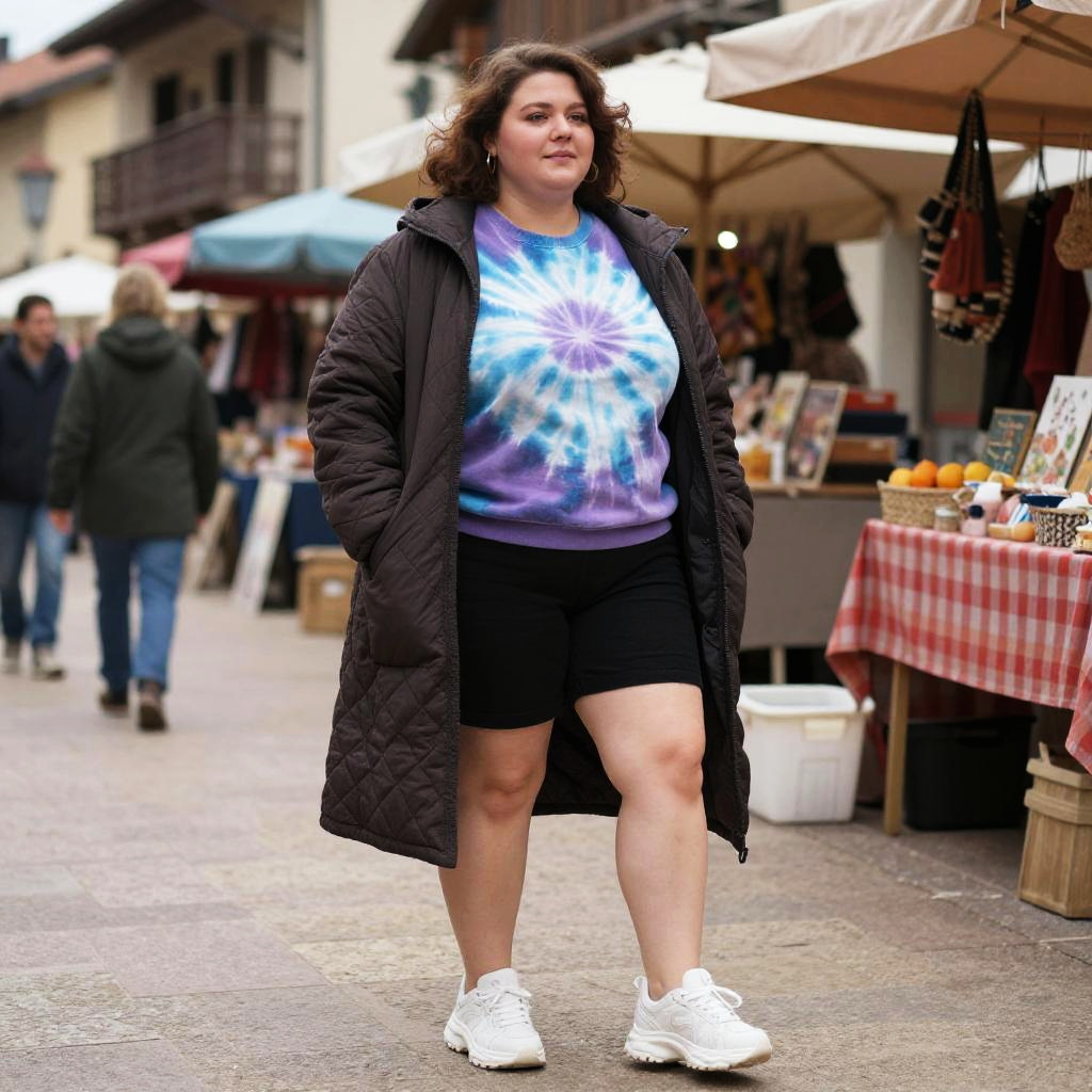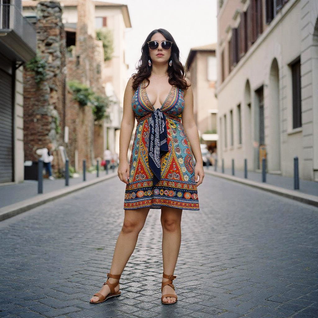A Stocky woman in a casual summer style, wearing a white eyelet lace mini dress with a square neckline and ruffled straps, complemented by a black belt and matching black sneakers. She stands at a vibrant outdoor market in a European village, surrounded by colorful stalls and bustling activity, captured in the rich tones of kodachrome analog film. Sexy. Pretty face and beаutiful eyes. Big breasts