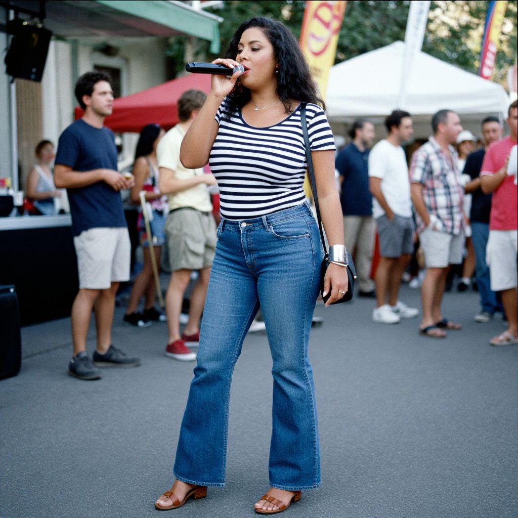 A Curvy woman in a casual style, wearing a navy and white striped t-shirt and bootcut denim jeans, stands at a vibrant street festival, enjoying live music. She has brown leather sandals and a minimalistic silver bangle, carrying a black shoulder bag. The scene is captured in the visual style of 3M Ferrania analog film stock. Sexy. Pretty face and beаutiful eyes. Big breasts
