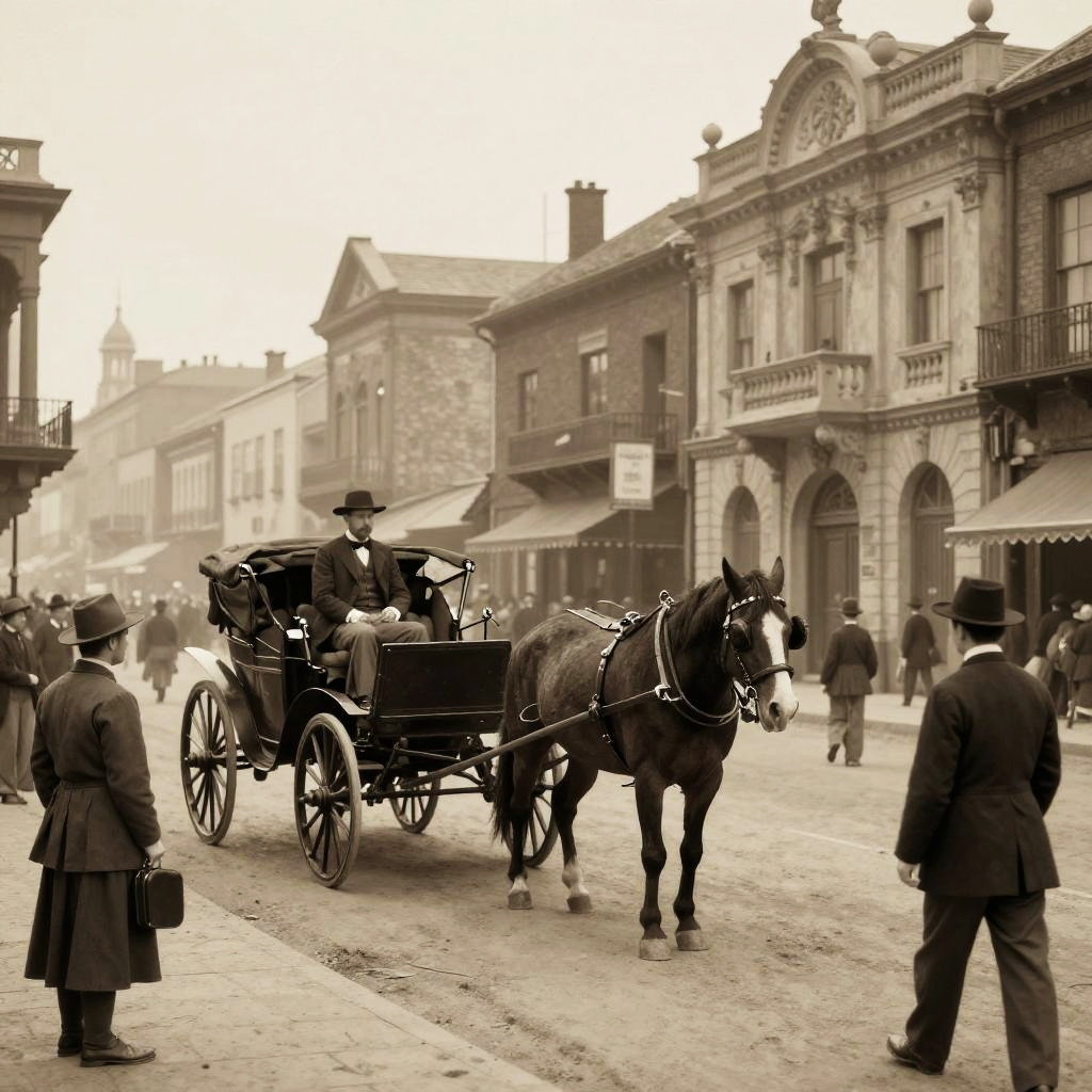 1929 vintage cityscape at dusk, classic cars and bustling streets, art deco architecture with neon signs, sepia tone, cinematic atmosphere, early 20th century urban life, high detail, warm lighting