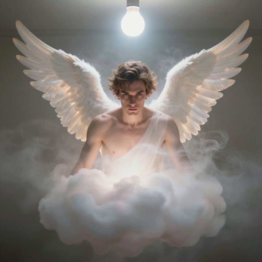 [[man,angel cloud]]Enigmatic figure, serene expression, radiant wings aglow, ethereal mist surrounding him, floating on a wispy cloud, soft diffused lighting from above, surreal ambiance, mysterious energy emanating from his presence, dreamlike setting, fluorescent bulb casting an unearthly glow, captivating scene. Man has masculine face and piercing eyes