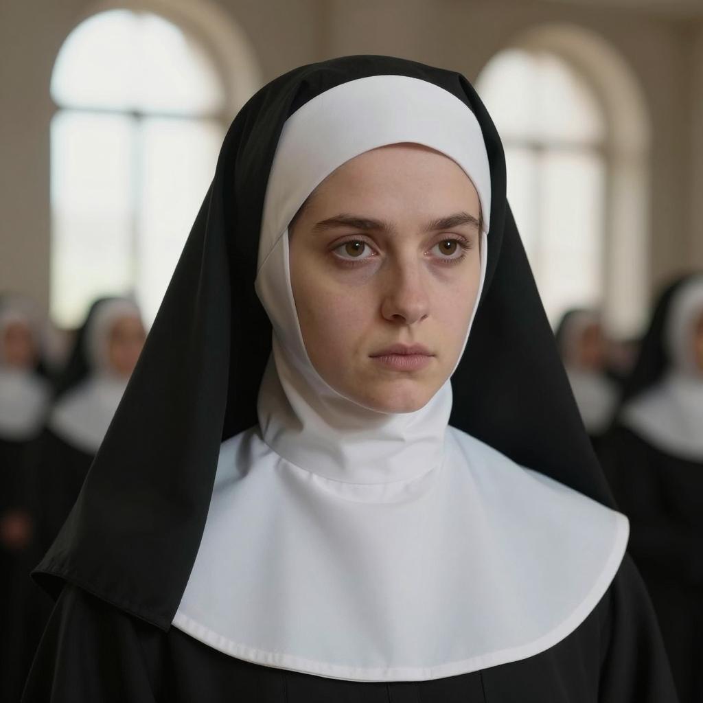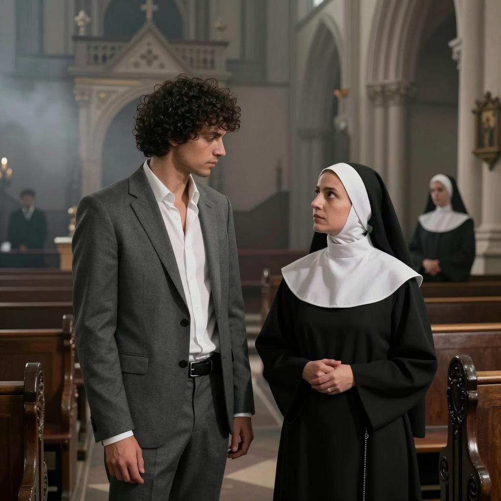 A man and a nun stand in a dimly lit, Gothic-style church. The man has curly black hair, wears a gray suit with an open shirt, looks at the nun. The nun wears a black habit with a white wimple, clasps her hands, looks up at him. Ornate wooden pews frame them. Smoke or mist fills the background. Two people.