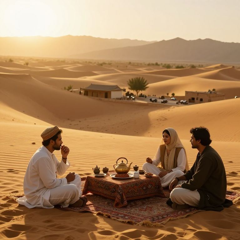 Pakistani prompt rendered in a cinematic style with golden sunlight, desert dunes, and a traditional tea house scene in a remote mountain village, full of warm tones and cultural details.