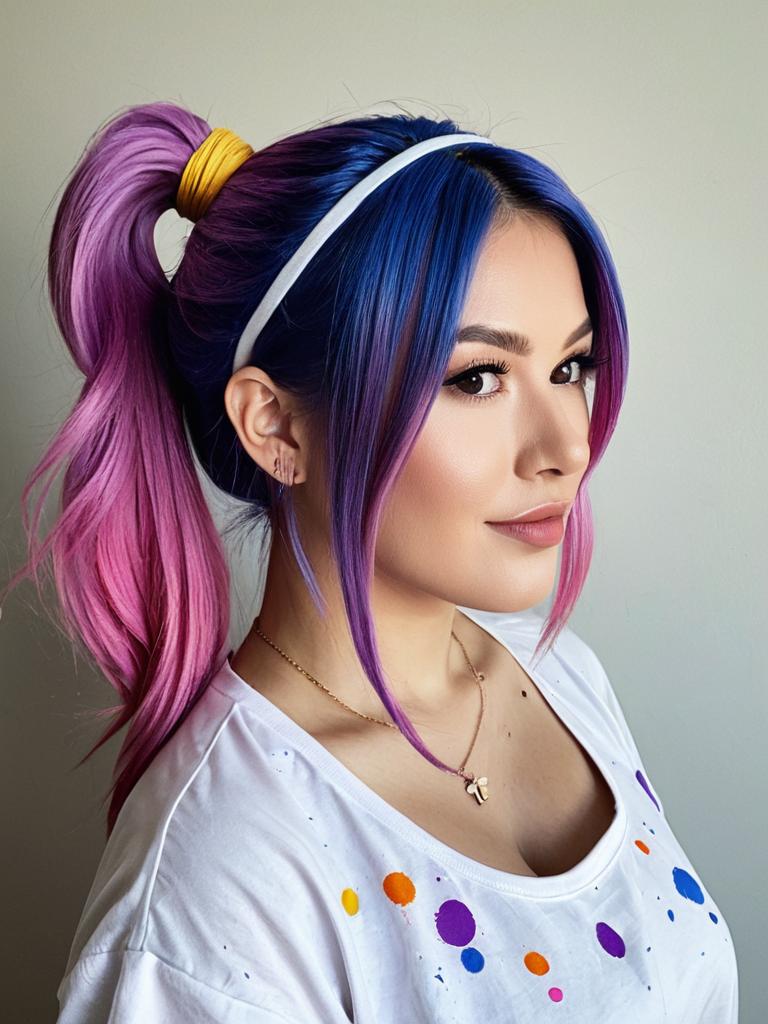 Photo-realistic portrait of a woman cosplaying as Airani Iofifteen with vibrant gradient hair in shades of pink, purple, and blue. She has a single side ponytail and a white hairband bow. The subject wears a white shirt adorned with colorful paint splatters, showcasing a modern casual style. The image features soft natural lighting and a shallow depth of field, emphasizing the smooth texture of her skin and detailed makeup.