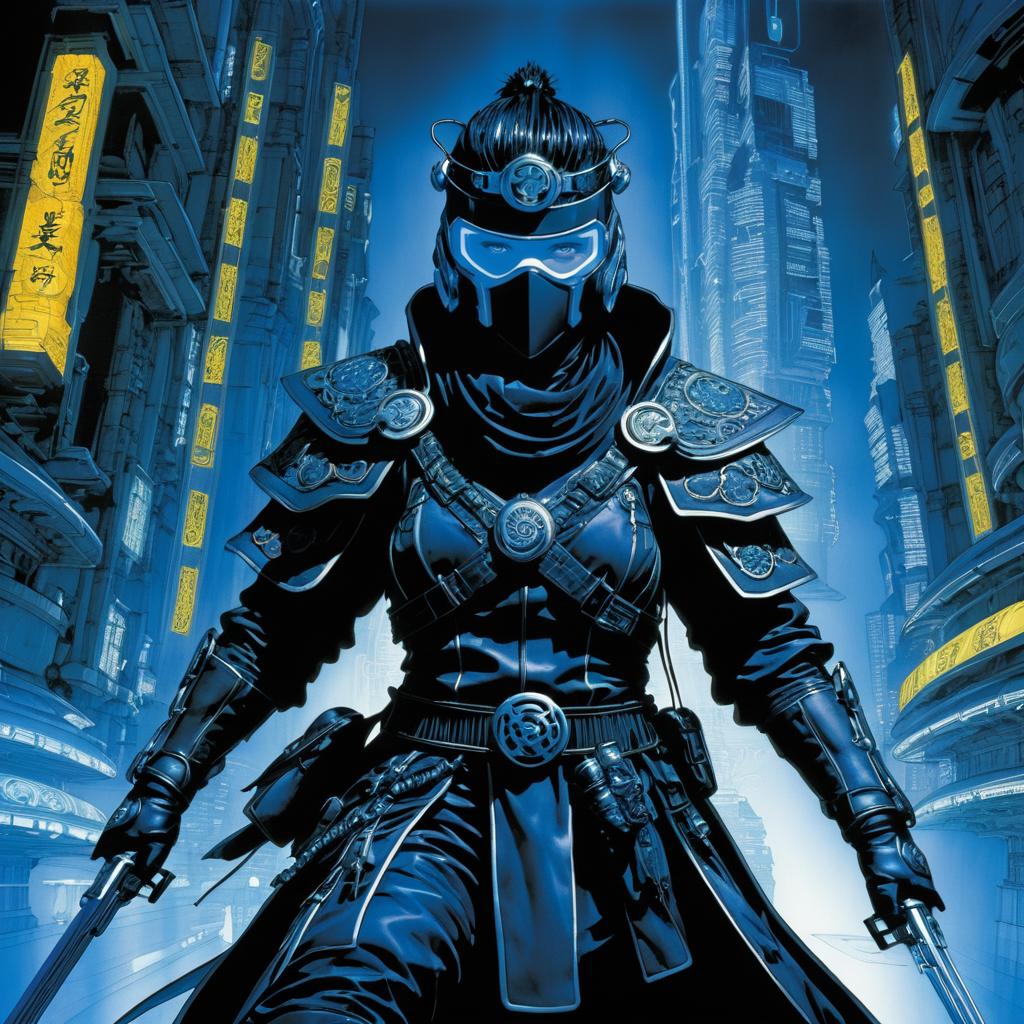 Highly detailed fantasy illustration of a cybernetic ninja character, featuring intricate armor with mechanical elements and face paint. The character stands in a futuristic cityscape with traditional Asian-style architecture illuminated by soft blue and yellow lighting, blending cyberpunk and fantasy aesthetics.