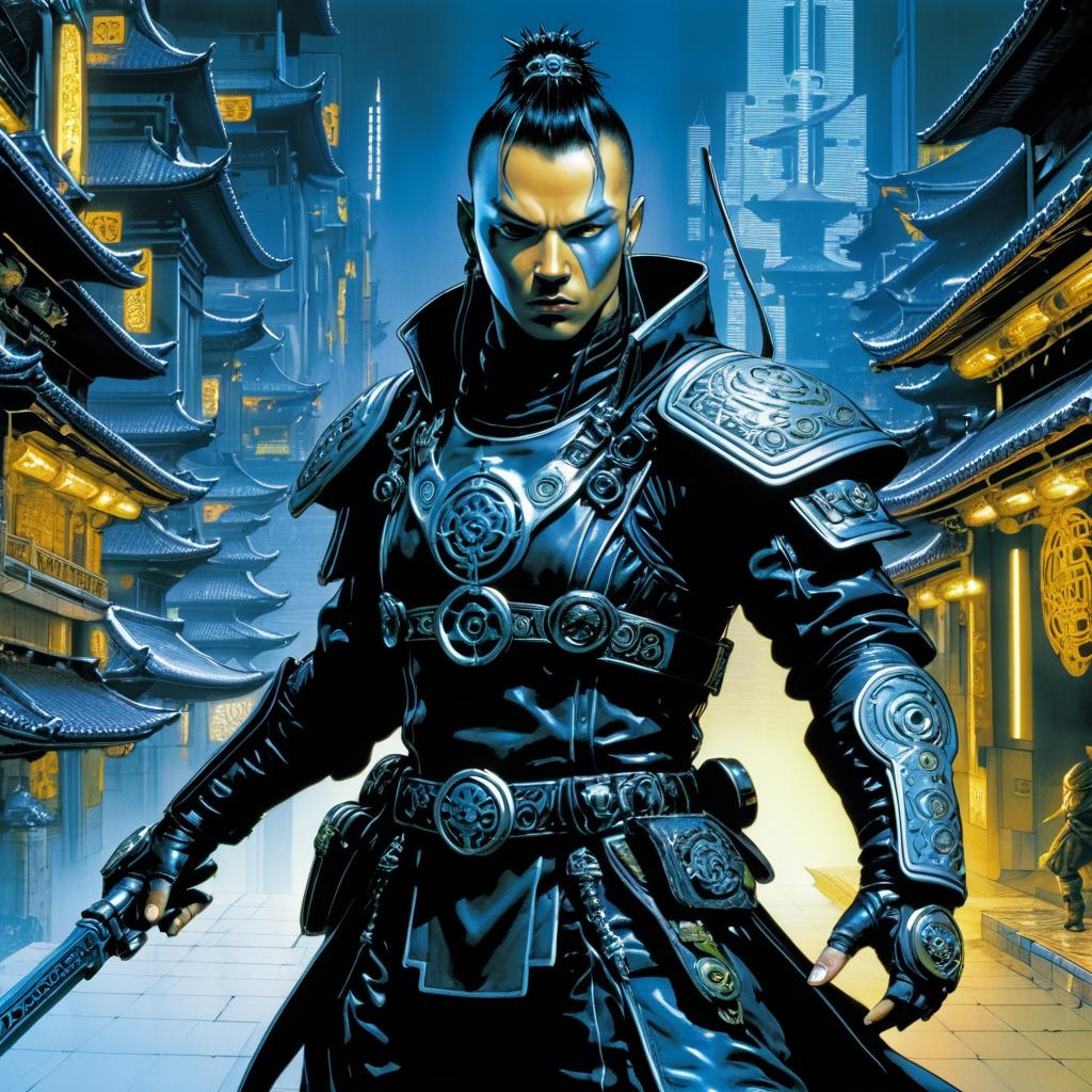 Fantasy character illustration of a cybernetic ninja in Shadowrun by Katsuya Terada, Paul Kidby. Styled with cinematic lighting and high detail.
