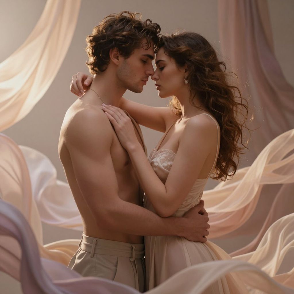Stable diffusion erotic theme, a sensual and artistic portrayal of a couple embracing in soft, warm lighting, surrounded by flowing fabrics and gentle, dreamlike colors, emphasizing intimacy and elegance in a surreal environment.