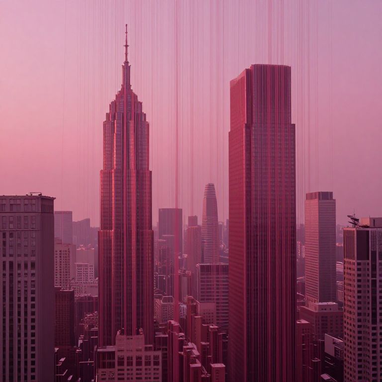 Photograph of a cityscape at sunset, featuring tall skyscrapers with a pink and purple hue. The tallest building on the left has a classic Art Deco spire, while the larger, rectangular building on the right has a modern design. Vertical lines of light cascade from the top center, adding a dramatic effect. The sky transitions from pink to purple, casting a warm glow over the buildings. Smaller buildings fill the foreground, creating a dense urban environment. The image has a surreal, almost digital aesthetic due to the vibrant colors and light effects.