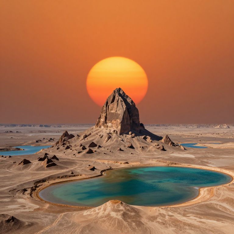 Vast desert landscapes stretch beneath a surreal sky, where a towering, jagged mountain peak rises sharply from the arid terrain, surrounded by scattered turquoise lakes and bathed in the warm glow of a massive, concentrically ringed orange sun hovering above.