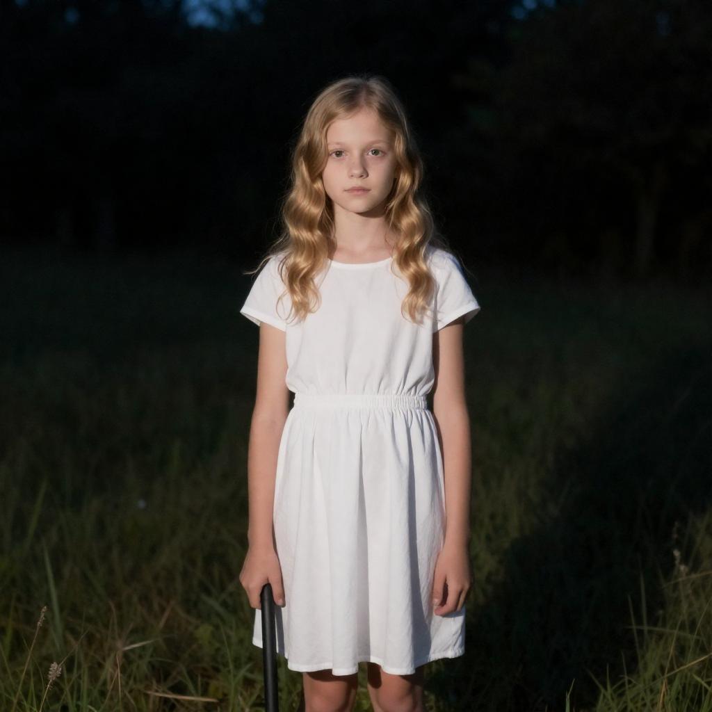 Photograph of a young blonde girl with long hair, wearing a red dress and white tights, standing next to a black, snow-covered, crashed car in a snowy forest. Snow is falling. Car's front left door is open, and windshield is cracked. Fallen leaves cover the ground. Girl's expression is neutral. Trees in background.