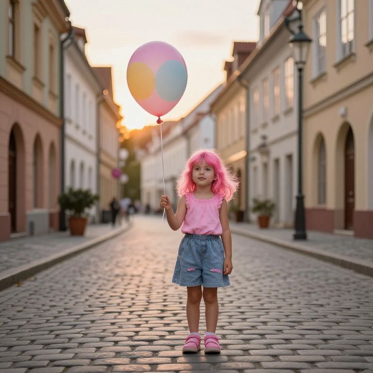 Pink hair little girl holding a colorful balloon, standing on a cobblestone street in a quaint European town at sunset, warm light and charming background