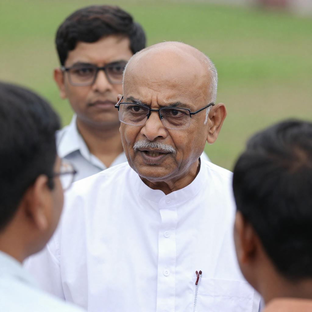 Photograph of a middle-aged Indian man with glasses and dark hair, wearing a light blue shirt, reading a paper. He is seated at a table with a metal grinder in front. Several other men with backs to the camera sit at nearby tables. Background includes blurred people and tables. Intense focus on the reading man.