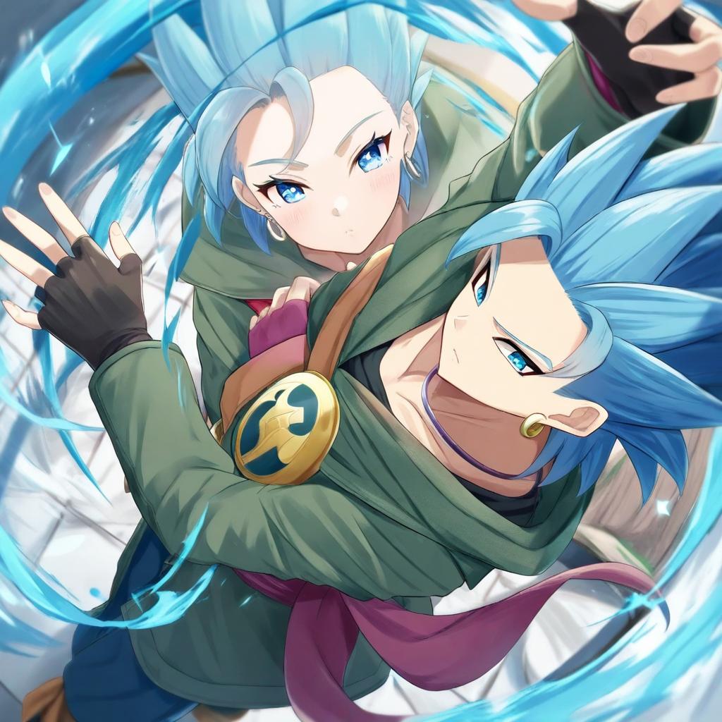 Camus (dq11), dragon quest, 1boy, blue eyes, short hair, spiked hair, blue hair, collarbone, fingerless gloves, long sleeves, earrings, necklace, by artist igayan, animagine