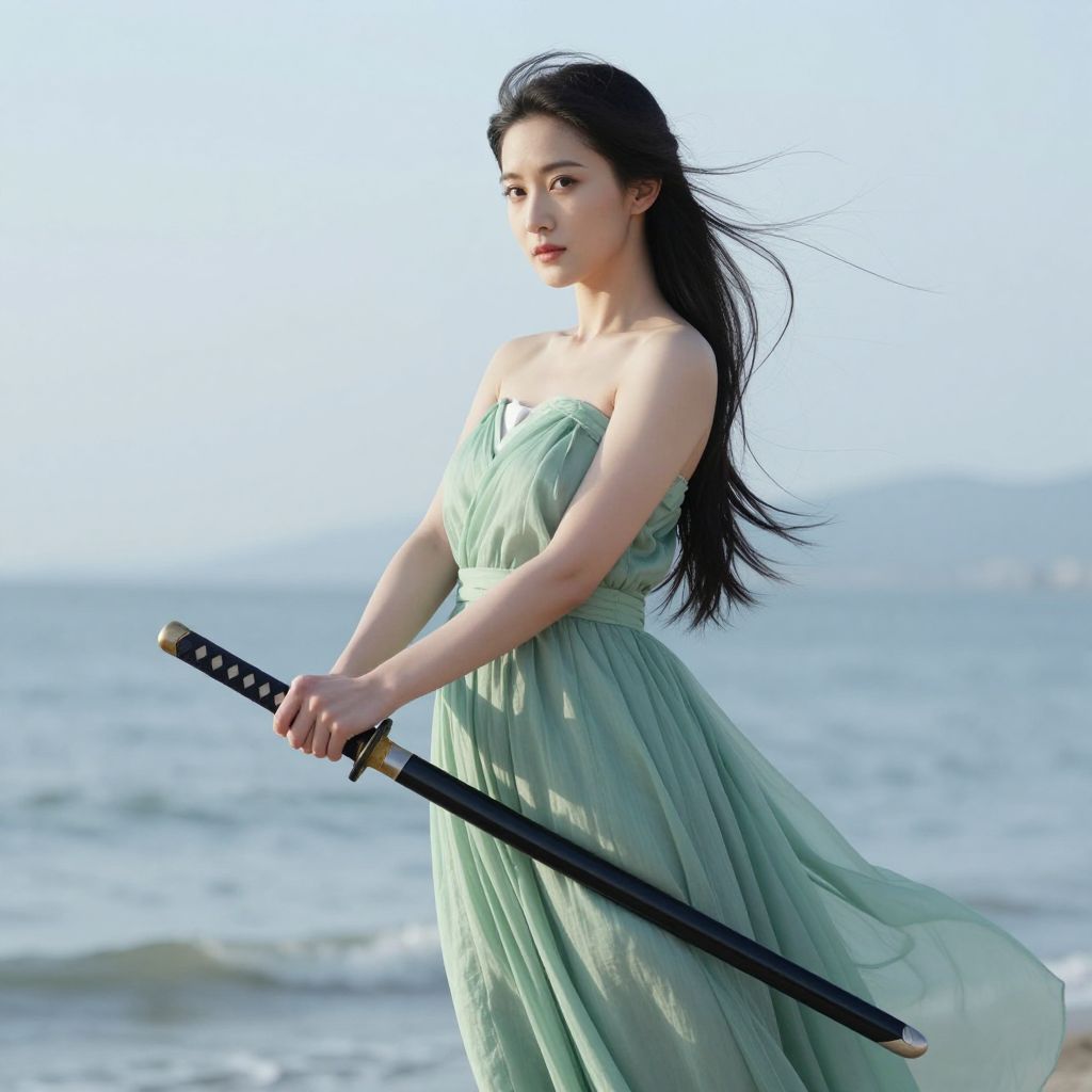 Photograph of an East Asian woman with long black hair standing on a beach. She wears a flowing, sleeveless, light green chiffon dress and holds a katana with both hands. Her expression is serious and focused. The background is a blurred, bright blue ocean horizon. The dress's delicate texture contrasts with the sharp, metallic sheen of the katana. The lighting is natural, highlighting her pale skin and the dress's ethereal quality. Her stance is poised and ready, suggesting a sense of strength and determination.