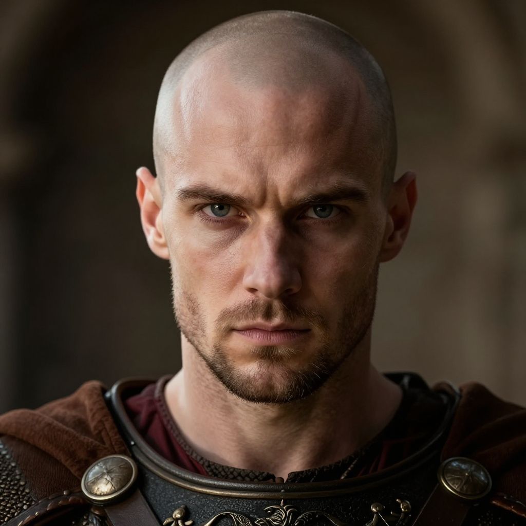 Alaric I: The Visigothic king, Alaric I, has a fierce and imposing presence, with a shaved head and intense eyes that reflect his martial prowess., perfect face, cowboy shoot, detailed face masterpiece, 8k, perfect quality, realistic, ultraclear detailed