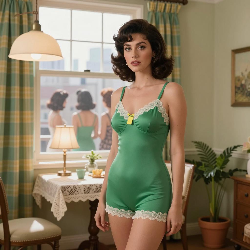 Woman with dark, voluminous 1960s-style hair wearing a green lace-trimmed babydoll nightie with a yellow tag stands in a sunlit room. Green and yellow plaid curtains cover a window with a cityscape view. A lace-covered table with a lamp and small items is in the background. A large, hanging lamp is on the left, and a chair is on the left side. Potted plants are on the right. Two more women with similar haircuts are partially visible through the window.