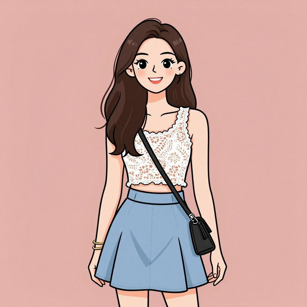 Woman with pretty face and pretty hair. smiling Woman, girly, white lace crop top with a floral pattern, sleeveless, round neckline, light blue skater skirt with a high waist, black crossbody bag with tassel detail, delicate gold bangle bracelets. --sref 1467