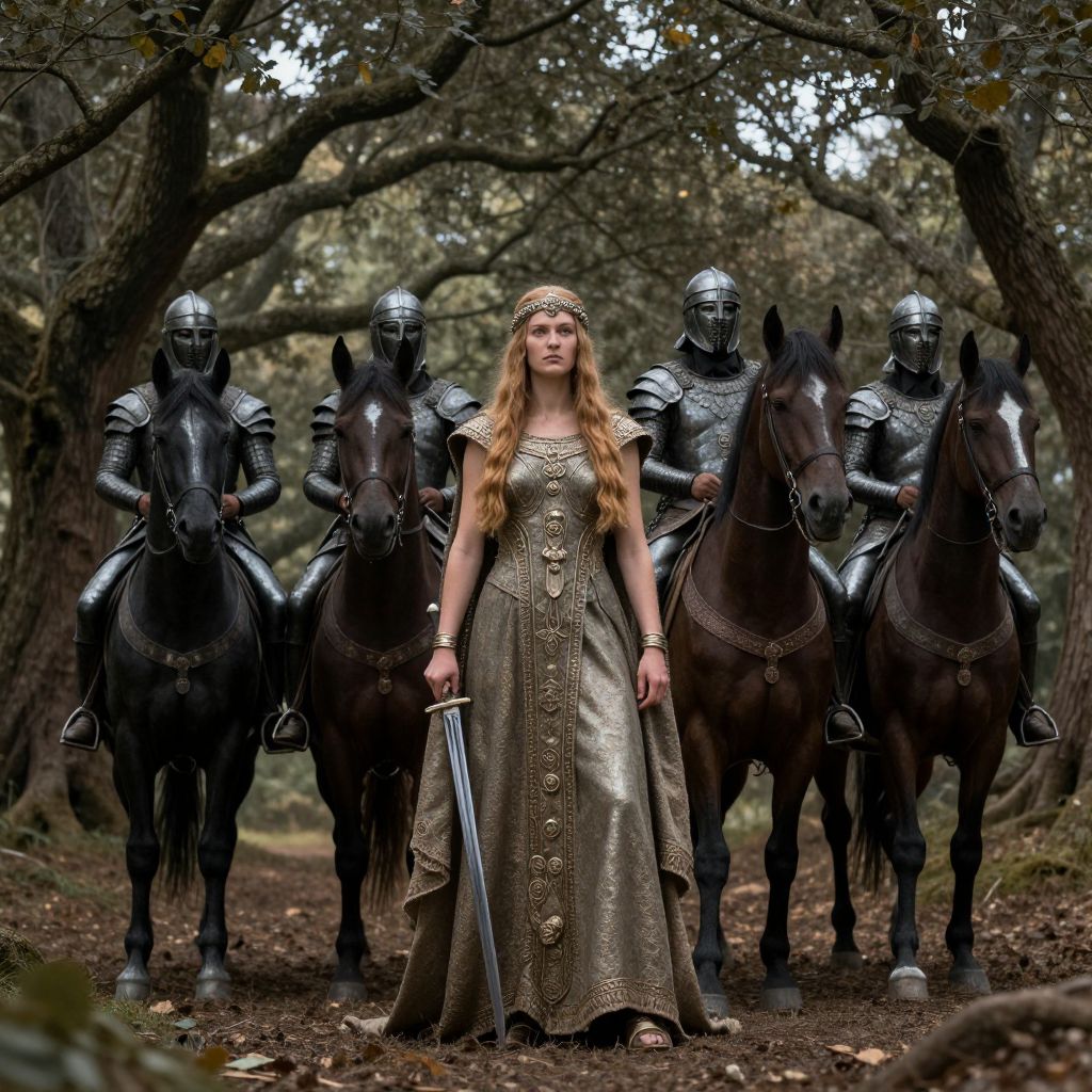 In this highly detailed and evocative artwork, a group of bronze age warriors, reminiscent of Celts or Ancient Britons, are depicted in a serene forest setting. The central figure, a woman adorned in elaborate, flowing robes and a headpiece, stands confidently with a sword in hand, her long hair cascading down her back. She is accompanied by three warriors on horseback, their armor and helmets suggesting a sense of readiness and discipline. The trees, with their intricate branches and leaves, frame the scene, adding depth and a sense of mystery. The color palette is muted, with earthy tones and soft lighting, creating a timeless and otherworldly atmosphere. The composition is balanced, with the woman and her warriors positioned centrally, drawing the viewer's eye through the scene. The overall effect is one of ancient ritual and sacred ceremony, evoking the spirit of the past and the enduring power of tradition.
