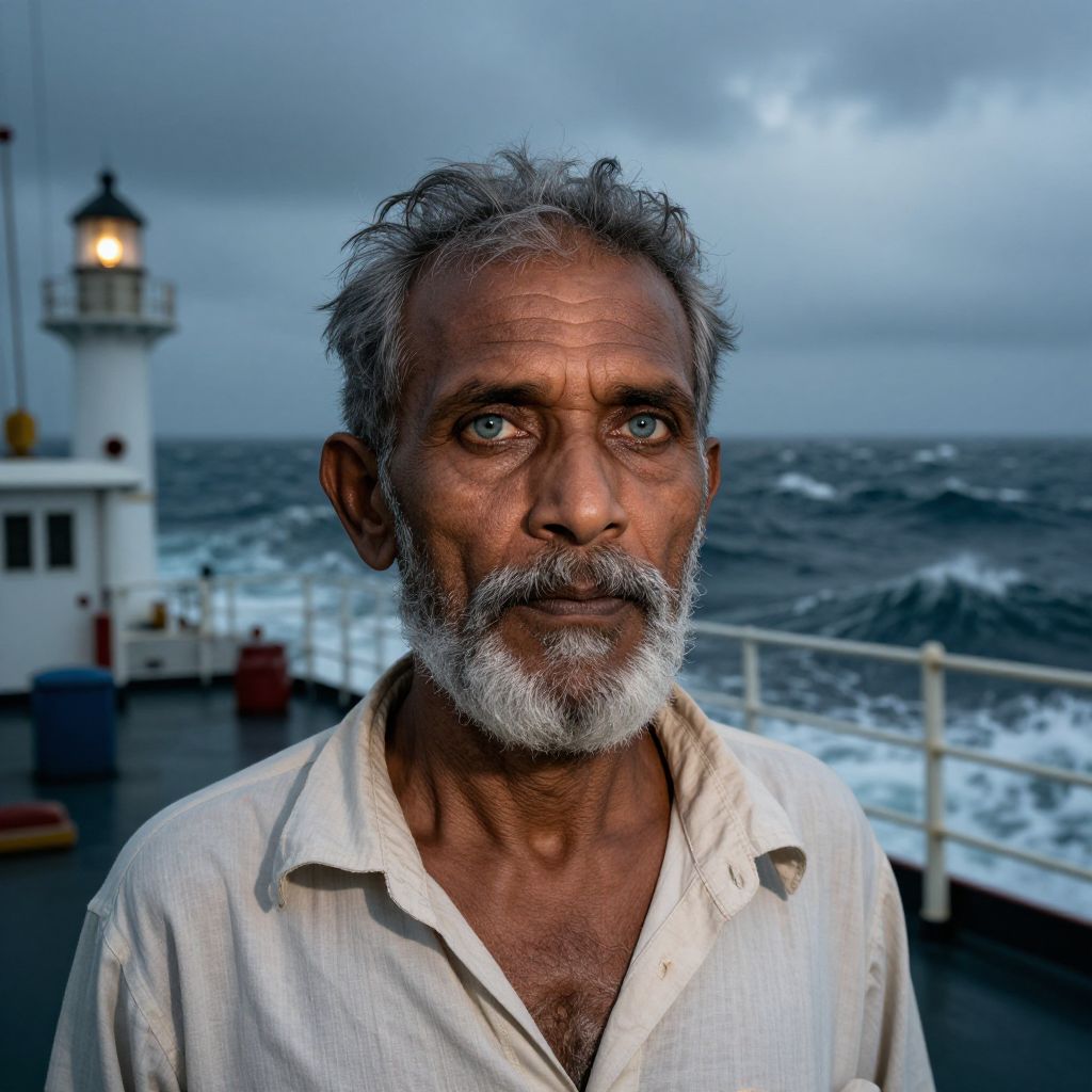 Visualize a captivating portrait of an elderly sailor, his warm blue eyes and graying beard set against a stormy ocean horizon. The scene is bathed in the soft glow from a distant lighthouse, illuminating his rugged features with a gradient of emotion: exhaustion yet resilience. This hyper-realistic portrayal seamlessly merges his gaunt face with the rough ship's deck, uniting South Asian man and vessel amidst the tumultuous sea.