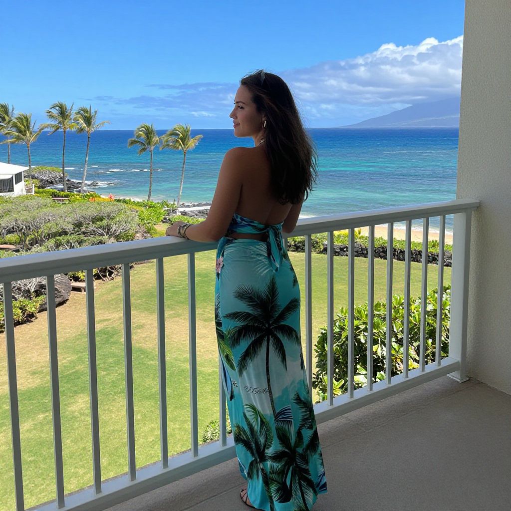 A woman in a stylish palm print maxi dress stands on a balcony overlooking a stunning ocean view at the Fairmont Kea Lani in Maui, Hawaii, capturing the essence of tropical elegance and high-definition scenic beauty.