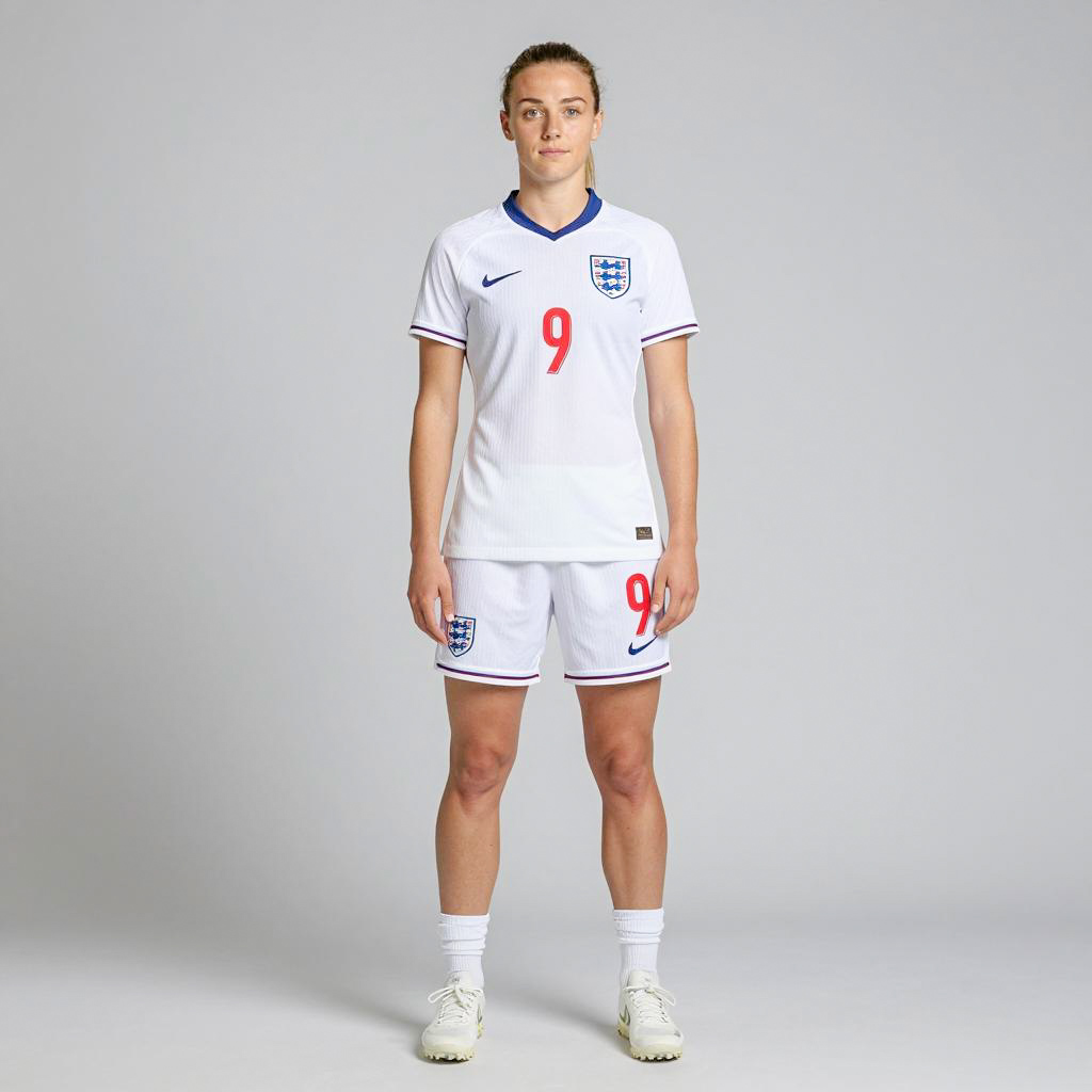 England football dress woman, photorealistic portrait of a young woman, standing, full body, facing forward, wearing a white England women's soccer jersey with blue collar and red number 9, short sleeves, white Nike on chest, plain gray background, neutral expression, brown hair in a simple ponytail, light skin tone, athletic build, wearing white sneakers, studio lighting, no additional accessories, casual pose, realistic ure, digital photograph style, portrait orientation