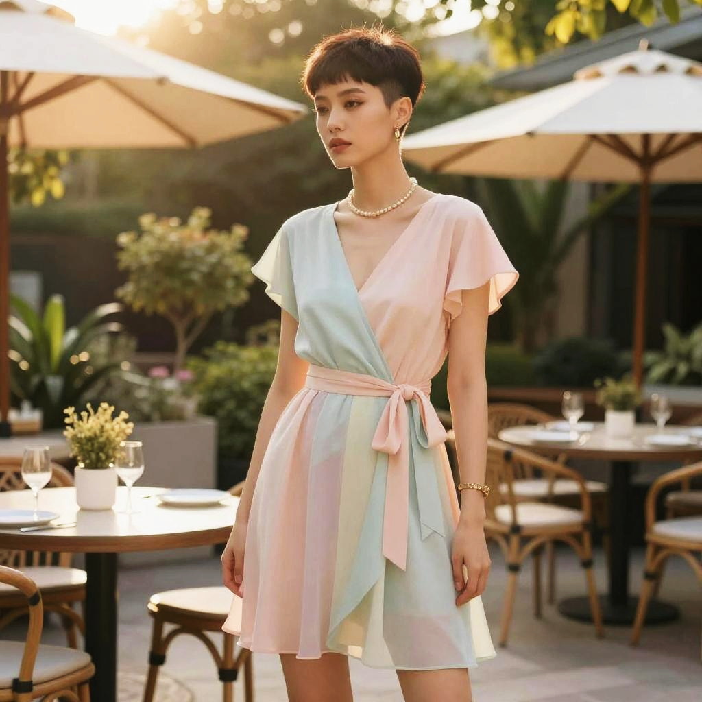 Nape Undercut hairstyle on fashion influencer, wearing pastel toned party dress, in garden restaurant patio, captured in fashion editorial style with soft golden hour shine.