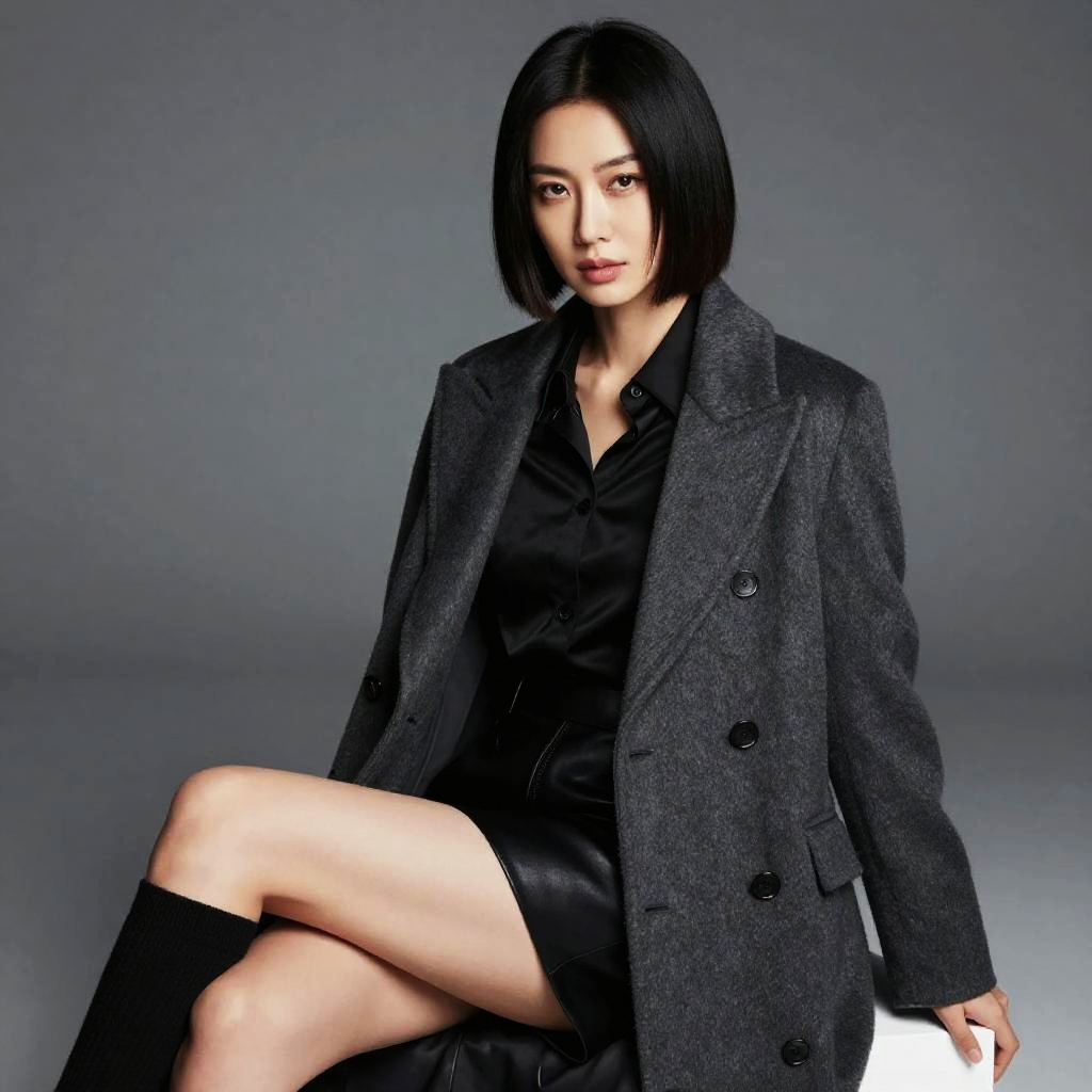 Photograph of an Asian woman with a sleek black bob haircut, looking directly at the camera with a confident expression. She's wearing a dark gray, double-breasted coat over a black satin shirt and black leather skirt. She's seated with one leg crossed over the other, showing off her black knee-high socks. The background is a simple, gradient gray, emphasizing her stylish and chic outfit.