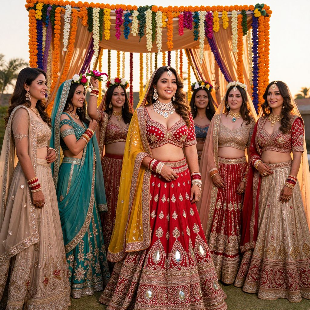 A vibrant lehenga wedding party in a traditional Indian wedding setting, featuring a diverse group of women dressed in ornate lehengas with gold and crystal embellishments, standing beside a beautifully decorated mandap under a colorful marigold and jasmine-themed canopy; one woman has a bright red lehenga with intricate mirror work and a glowing diamond neckpiece, her face wearing a joyful smile with warm brown eyes and soft brown curls, the others in colorful prints and sequins, holding floral crowns and traditional wedding veils in a golden-hour sunset.. The woman has big tits and cute face
