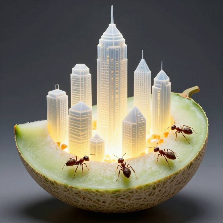 Within a luminous, translucent melon, a miniature metropolis emerges, its towering skyscrapers bathed in ethereal light, while four industrious ants traverse the fruit's interior, defying scale and expectation.