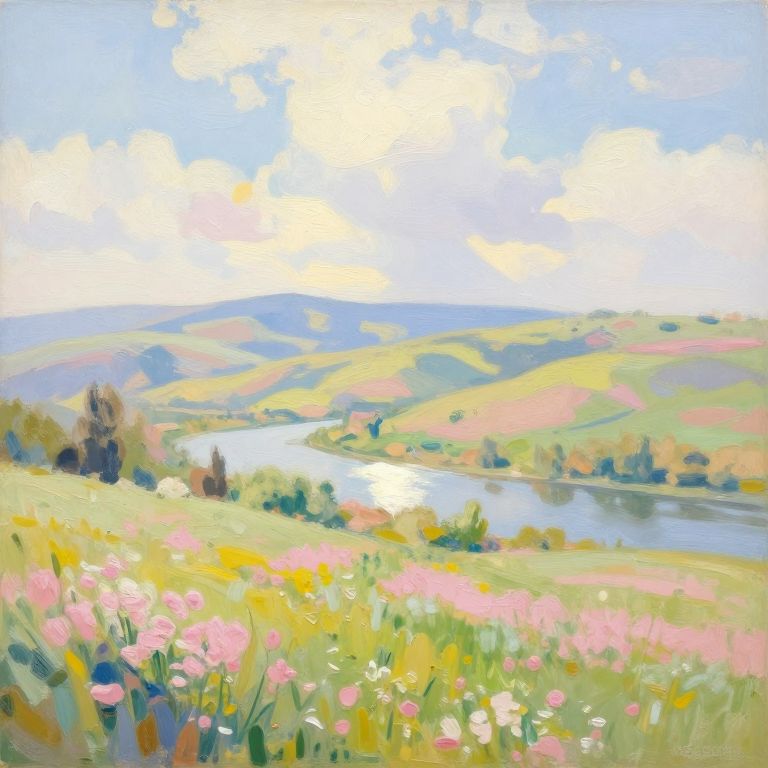 Paint:eqc2xc7dbv4= serene landscape painted with delicate pastel colors, featuring gentle rolling hills, blooming flowers, and soft sky hues, impressionist style with smooth brushstrokes and warm sunset lighting